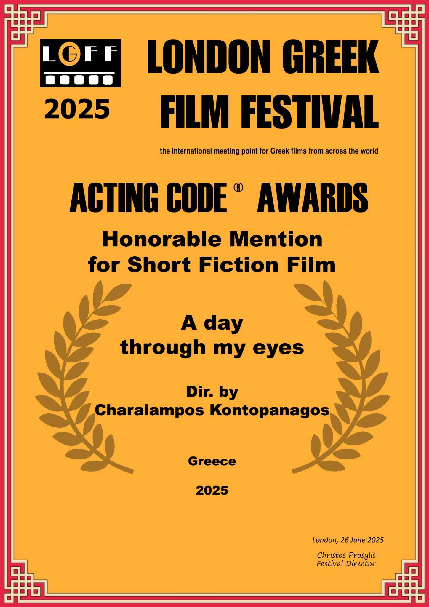 London Greek Film Festival 2025 - Honorable Mention for Short Fiction Film - Acting Code Award